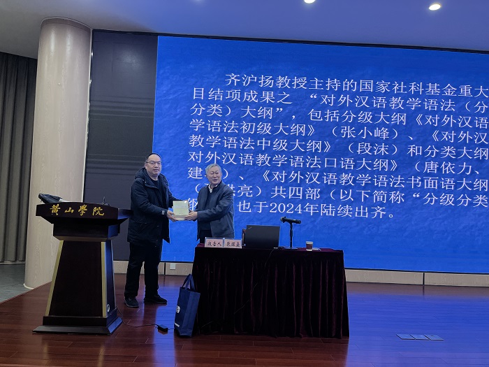 报告会前,沈昌明经理代表WilliamHill中文官方网站接受了张旺熹教授主编的对外汉语教学语法丛书之《对外汉语教学语法初级大纲》《对外汉语教学语法中级大纲》《对外汉语教学语法口语大纲》《对外汉语教学语法书面语大纲》,并合影。