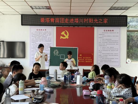在塔川村“阳光之家”的诗词课堂中,团队成员们精选《泊船瓜洲》、《示儿》、《九月九日忆山东兄弟》、《枫桥夜泊》等经典诗词进行教学,通过生动讲述诗人故事、讲解创作背景、逐句分析和情感赏析,带领孩子们诵读品鉴,感受中华传统诗词的独特魅力。课堂氛围活跃,朗朗书声中,不仅传授了知识,使国学经典焕发出新活力,更深化了孩子们对中华文脉的认知和认同,培养了文化自信和爱国情怀,点燃了文化传承的火种。