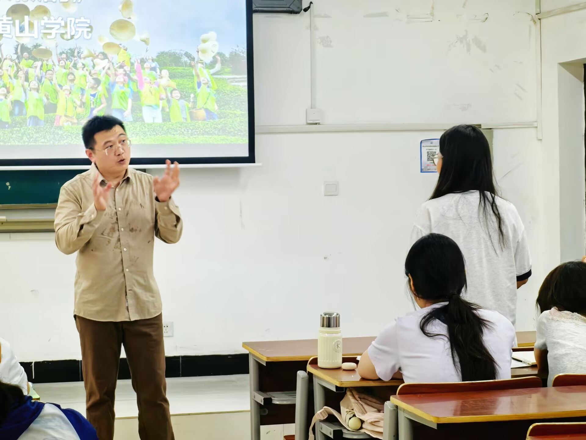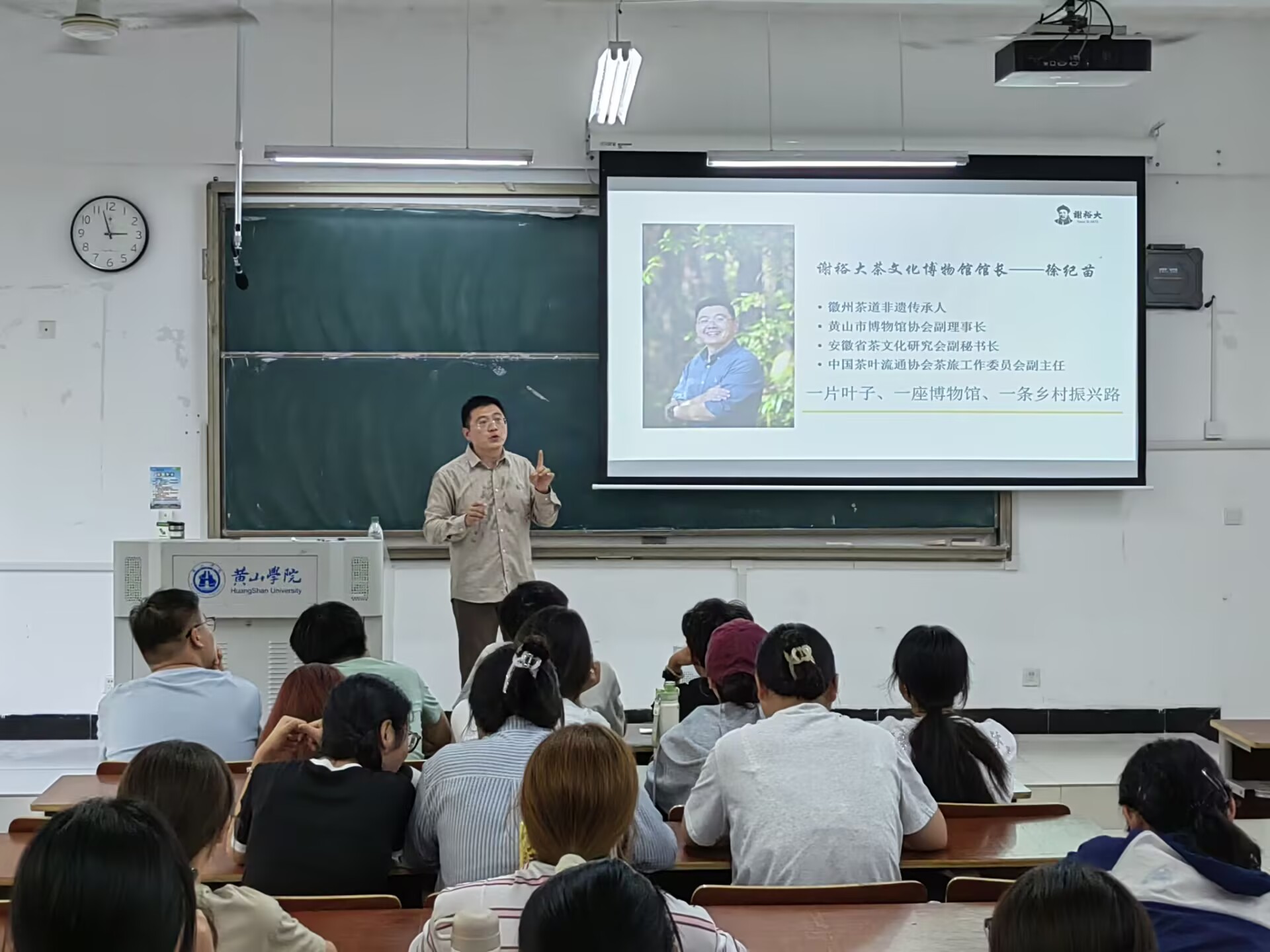 讲座伊始,馆长徐纪苗以“一片叶子、一座博物馆、一条乡村振兴路”为引,结合其17年博物馆工作经验,生动阐述了茶与徽州地域文化、乡村发展的紧密联系。他系统梳理了中国茶叶的主要产区分布,让同学们对茶叶知识有了全面认知。随后,徐纪苗积极与员工互动,借此引导同学们深入理解茶文化并非静止的传统,而是在创新中发展演变,早已融入现代生活。