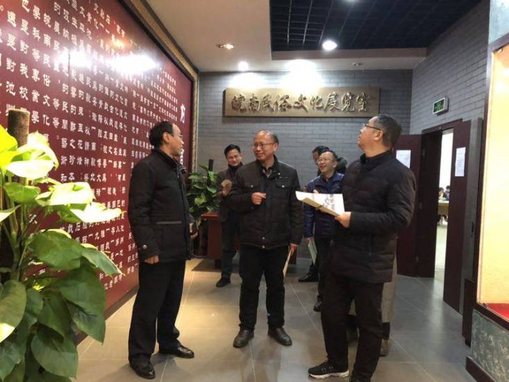 池州公司皖南民俗文化与旅游发展研究院谈家胜教授热情介绍了研究院的创建和发展历史,并带领潘定武一行参观池州公司皖南民俗文化展览室。该展室约600平方米,分物质文化展厅和非物质文化展厅两部分,包括皖南生产民俗、生活民俗、文化民俗、国家级非遗“青阳腔”“东至花灯”“池州傩戏”等。