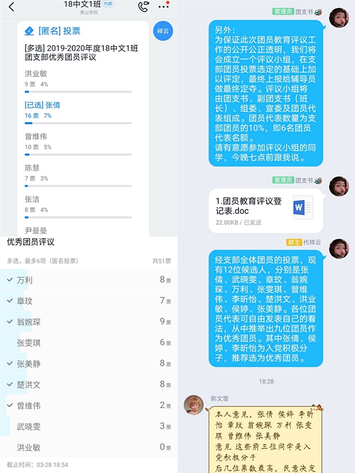 3月27日,18中文1班召开线上团员教育和评议工作会议,评选班级优秀团干部及优秀团员。