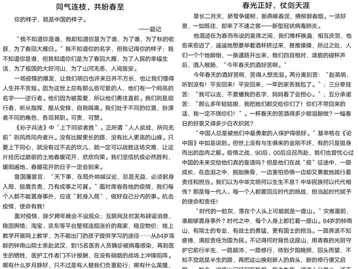 此次征文活动面向该院全体员工,由写作兴趣小组指导教师担任评委。同学们积极响应并踊跃投稿,有的讲述自己疫情期间的志愿服务,有的讴歌各行各业服务奉献精神,字里行间无不表现出对祖国的感恩,对抗疫英雄的崇敬,激发了当代老员工对使命担当的思考,取得了良好的效果。