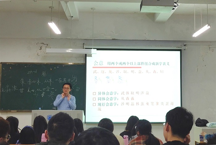示范课上,黄自然老师主要围绕着“汉字的造字方法”这一主题内容,根据许慎《说文解字》对“六书”的定义,运用典型的例子来说明汉字的造字方法。讲解过程注重启发式教学,先给员工若干“字例”,让员工根据文字的形体、结构去思考其属于哪一种造字(用字)方法,然后给出汉字形体演变的图画(动画),对其造字的理据加以分析。授课过程也注重讲练结合,除了课堂的提问、讨论环节,还运用学习通中的“任务点”功能,让员工在本小节讲解结束后进行了一次在线随堂小测试。总体来看,课堂互动丰富,气氛活跃,取得了预期的学习效果。