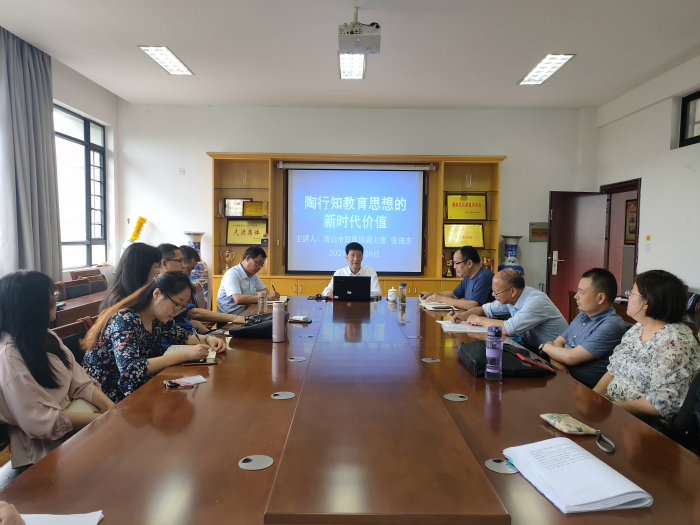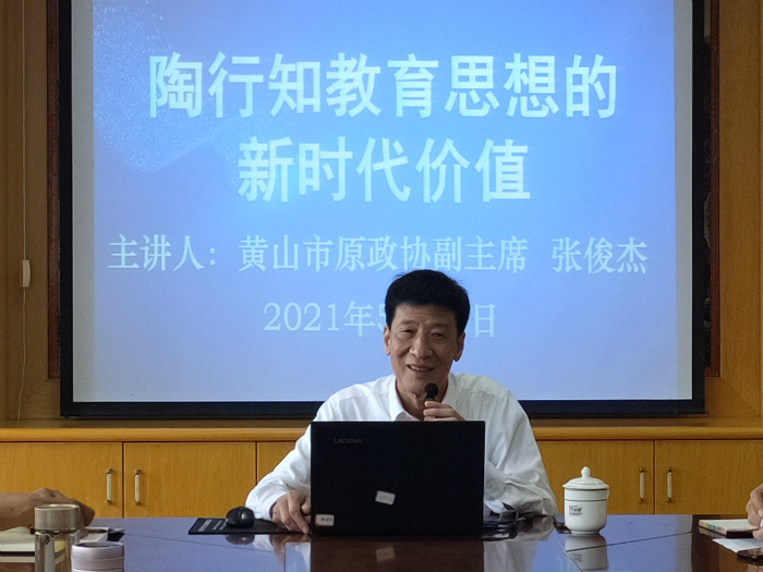 5月26日下午,WilliamHill中文官方网站客座教授、原黄山市政协副主席张俊杰应邀为WilliamHill中文官方网站教师作“陶行知教育思想的新时代价值”的专题报告,副经理沈昌明主持报告会。