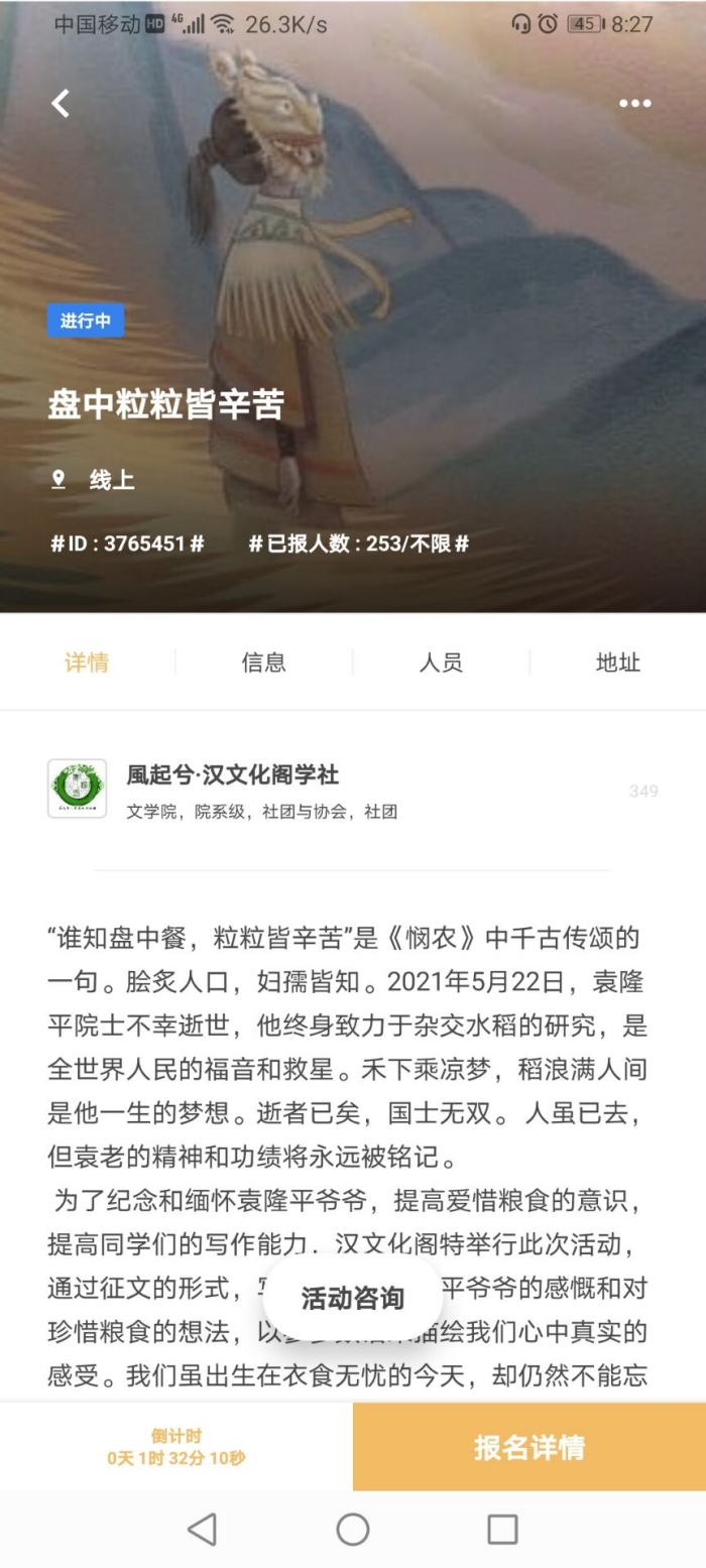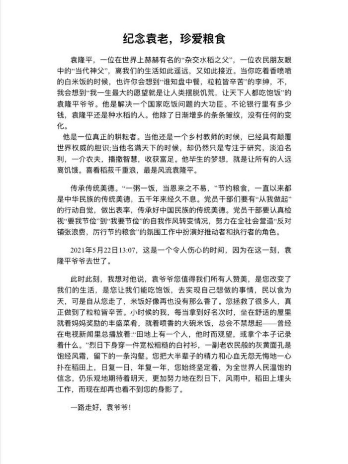 为了纪念和缅怀袁隆平,提高爱惜粮食的意识,提高同学们的写作能力,風起兮·汉文化阁于2021年6月6日举办“盘中粒粒皆辛苦”活动线上活动,共两百余人参与。