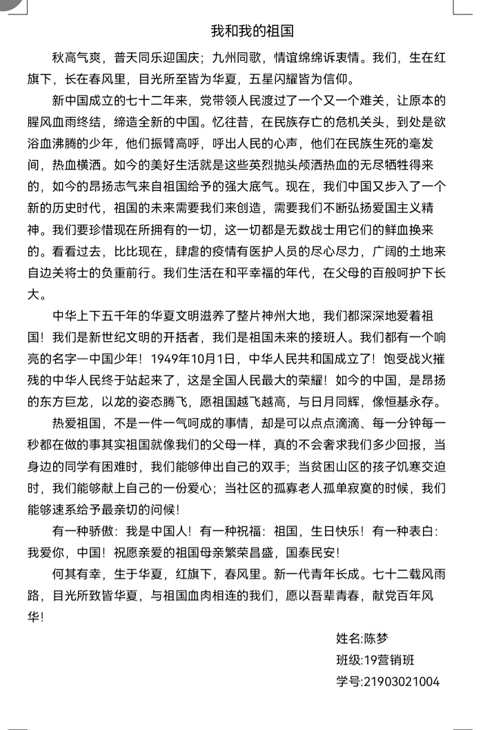 活动共历时天,同学们积极参与写作活动期间,工作人员收到大量来稿,文章不仅层次清晰内容各具特色并且从不同的角度进行写作,表达同学们对祖国深切情感。经过评审人员公平审稿,最终评选出一批优秀作品。在工作人员根据评选结果发放相应的学分及奖品后,此次活动圆满完结。