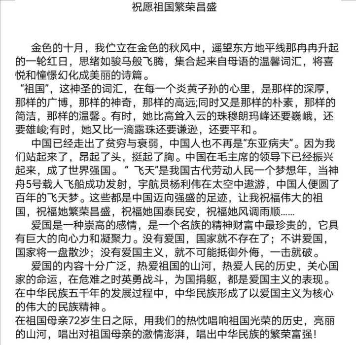 本次活动主要是鼓励参与者借此次活动,来激发同学们的爱国主义情怀,增强民族意识。表达不忘初心,牢记使命的决心,把祖国推向更美好的明天。以国庆节心中所想所思所念来抒发情感、诉说情思以及表达情感,同时将这些情感写成一篇500字左右的文档,要求是原创作品,不得出现抄袭。活动发布后,参与者通过官Q了解活动主题及规则,要求参与者必须理解规则后再开始作品创作。10月11日20点之前参与者线上上交作品至指定文档,参与者提交时需要注明姓名学号。负责人收集完作品之后挑选优秀作品在官Q展示,同时为优秀作品作者线下发放奖品。