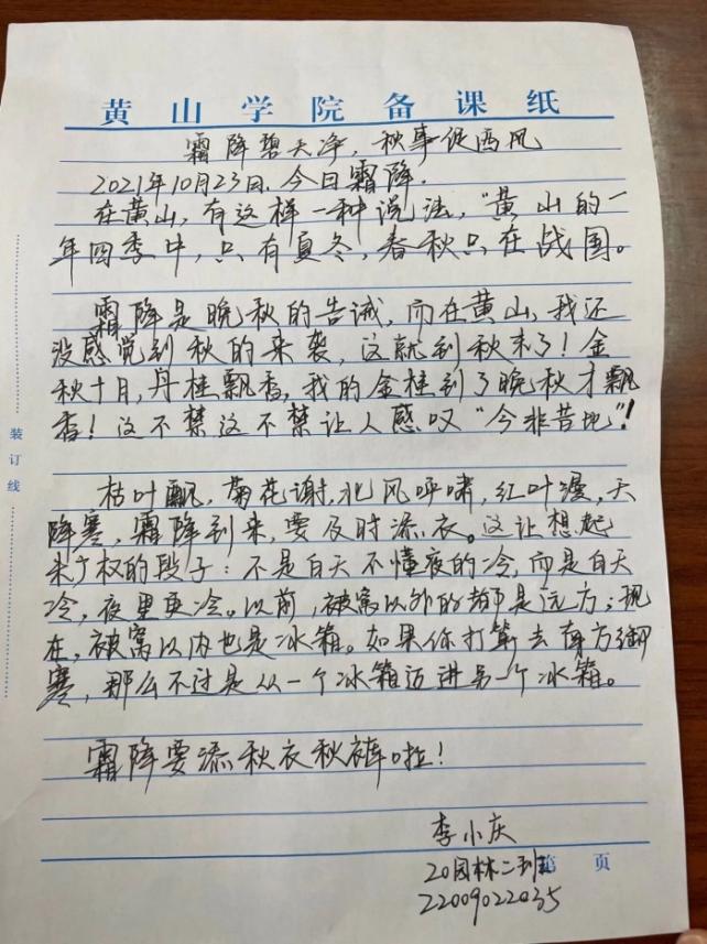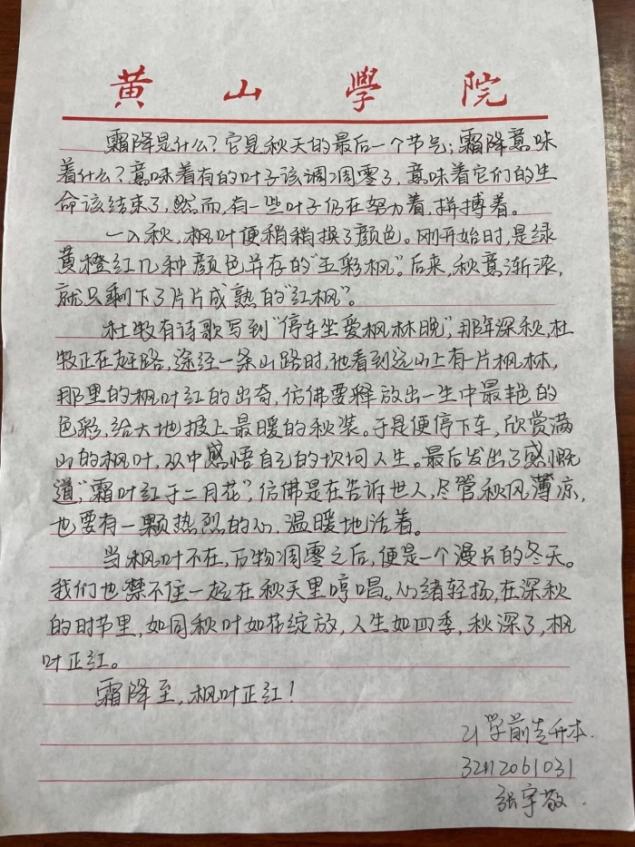 在工作人员的努力和同学们的积极参与下,此次活动取得了圆满的成功。通过本次活动使得同学们对霜降有了更多的了解,也增强了自己写作的能力,更加真切体会到内心的情思,表达心之所想,找到心之所向,进一步领略到文字的魅力。与此同时,这次活动的举办使社团成员内部凝聚力和协作能力得到提升,可以更好地完成社团的工作。