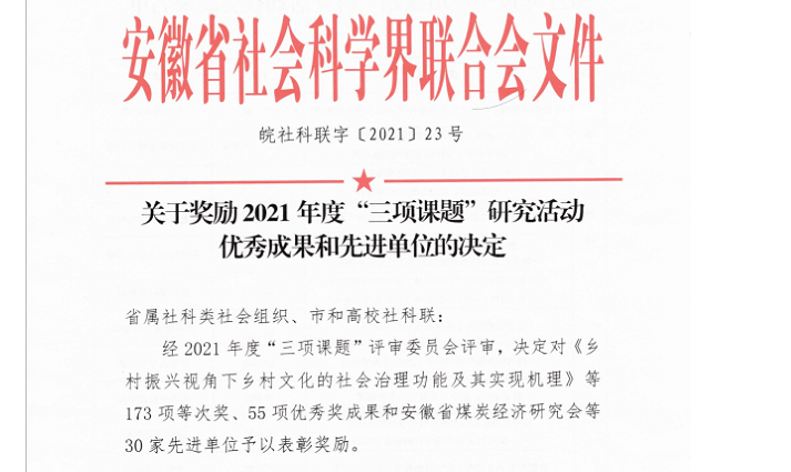 近日,安徽省社会科学界联合会公布了2021年度“三项课题”研究活动优秀成果奖名单,公司杨辉老师和戴元枝老师分别获得二等奖。
