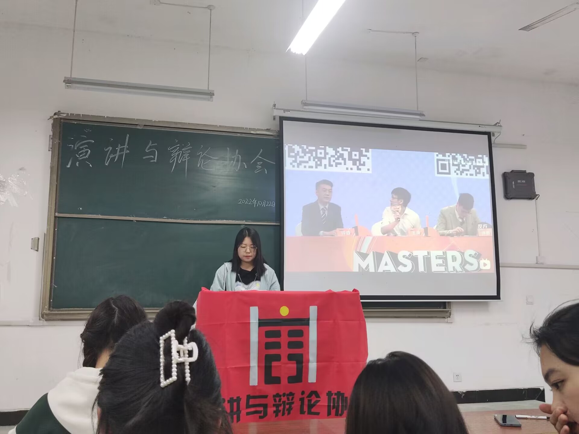 2022年10月22号,演讲与辩论协会在文端楼2205成功举办“演讲与辩论协会新国辩观影”研讨会,活动由演讲与辩论协会成员组织22级新生作为观众和发言者一起共同参与。