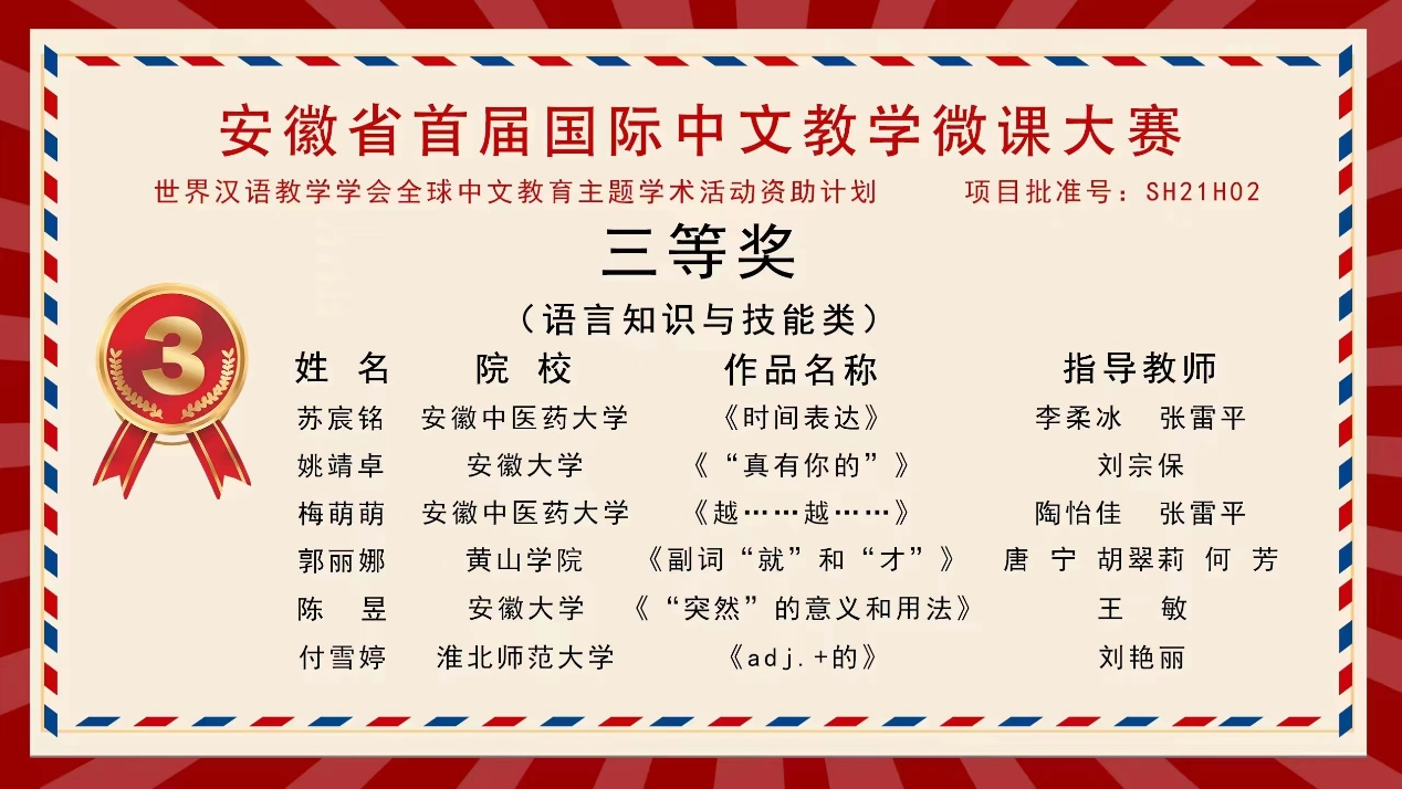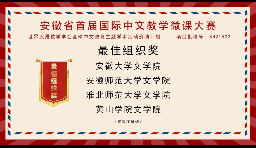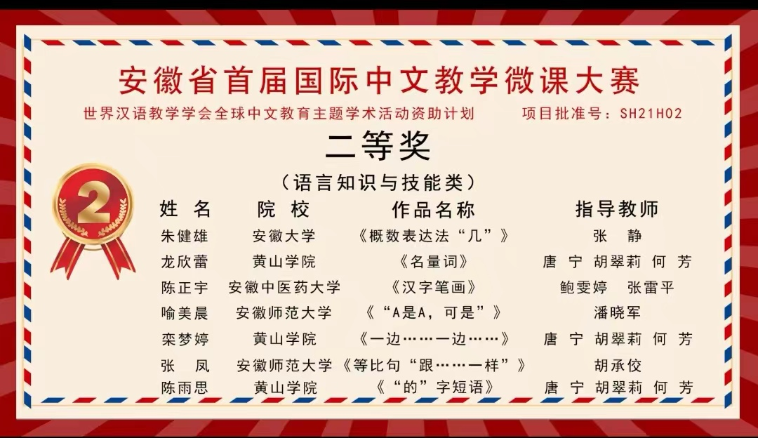 11月20日,安徽省首届国际中文教学微课大赛结果揭晓。公司WilliamHill中文官方网站汉语国际教育专业12名同学经过激烈角逐,3人获二等奖 、2人获三等奖、7人获优胜奖,在同类院校中处在前列。williamhill官方网站荣获“最佳组织奖”。