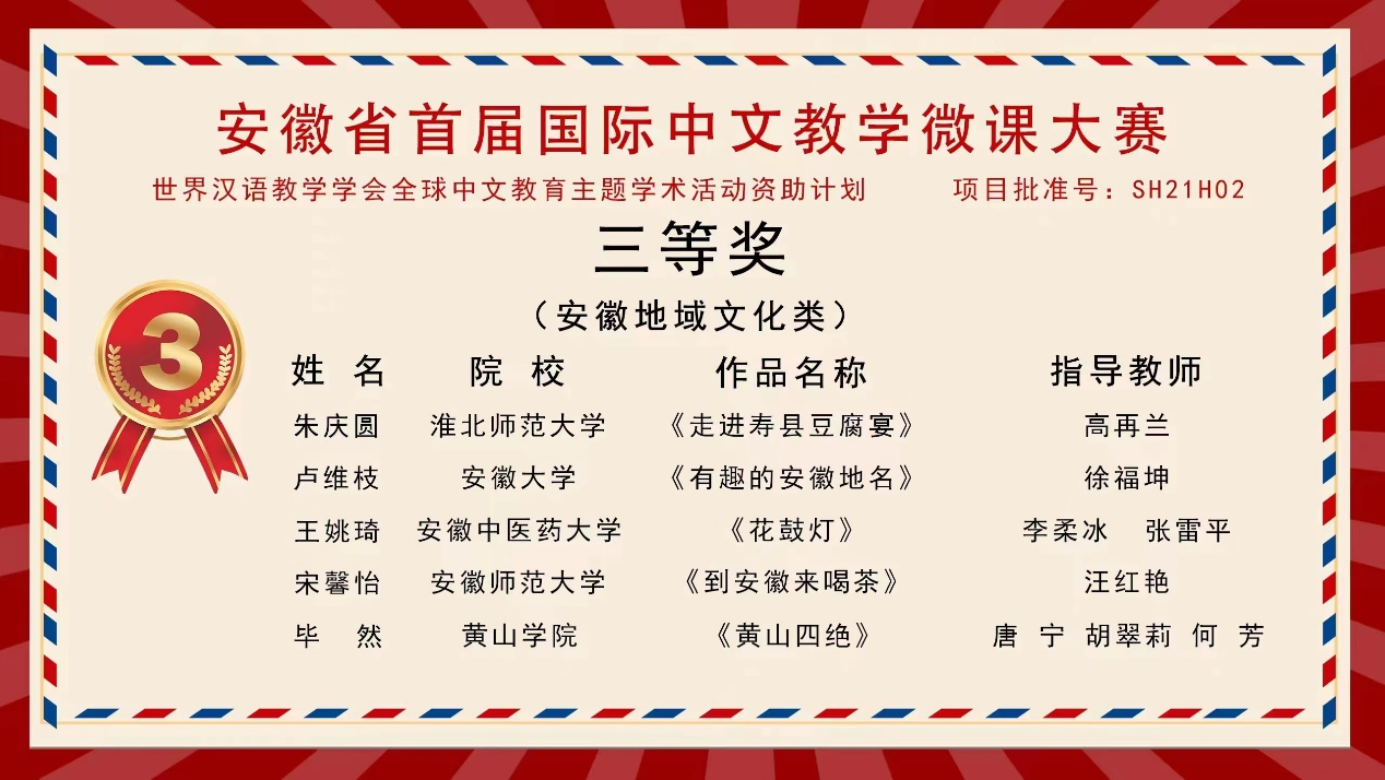 本次大赛由安徽省汉语国际教育研究会主办,安徽大学WilliamHill中文官方网站承办。大赛旨在加强信息化教学手段在国际中文教育领域中的运用,搭建教学经验交流和教学风采展示平台,提升国际中文教师的信息技术应用能力。此次比赛打破传统课堂教学模式,将授课过程与技术功能相结合,借助信息化教学手段丰富展示内容,提高教学效果,参赛作品均以视频提交。赛前,组建了唐宁、胡翠莉、何芳等老师为团队的指导教师组,针对大赛规则,认真遴选选题,积极指导员工备赛。选题包括语言知识与技能、文化知识两大板块,语言知识与技能板块包括语音、汉字、词汇、语法和语言技能等内容,文化知识板块主要涵盖安徽的历史名城、历史名人、文物、思想观念、文学、建筑、雕塑、书画、音乐、戏曲、民间工艺、世界文化遗产、地理、民俗、中医养生、安徽方言、当代安徽、游在安徽等内容,既有道的理解,又有术的运用,体现了现代信息技术视域下汉语国际教育人才的能力需求。