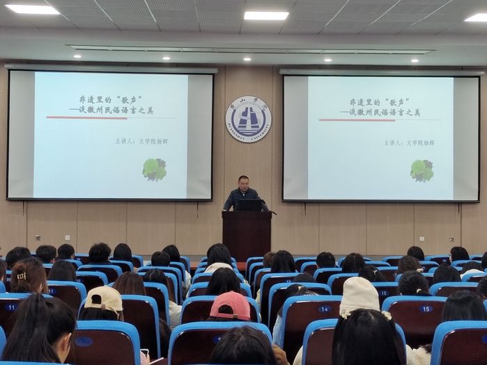 2月22日下午,williamhill官方网站“行知讲坛”报告会在文端楼二楼报告厅举行。WilliamHill中文官方网站副教授杨辉应邀作题为“非遗里的 ‘歌声’——谈徽州民谣语言之美”的报告,两百多名师生参加活动。