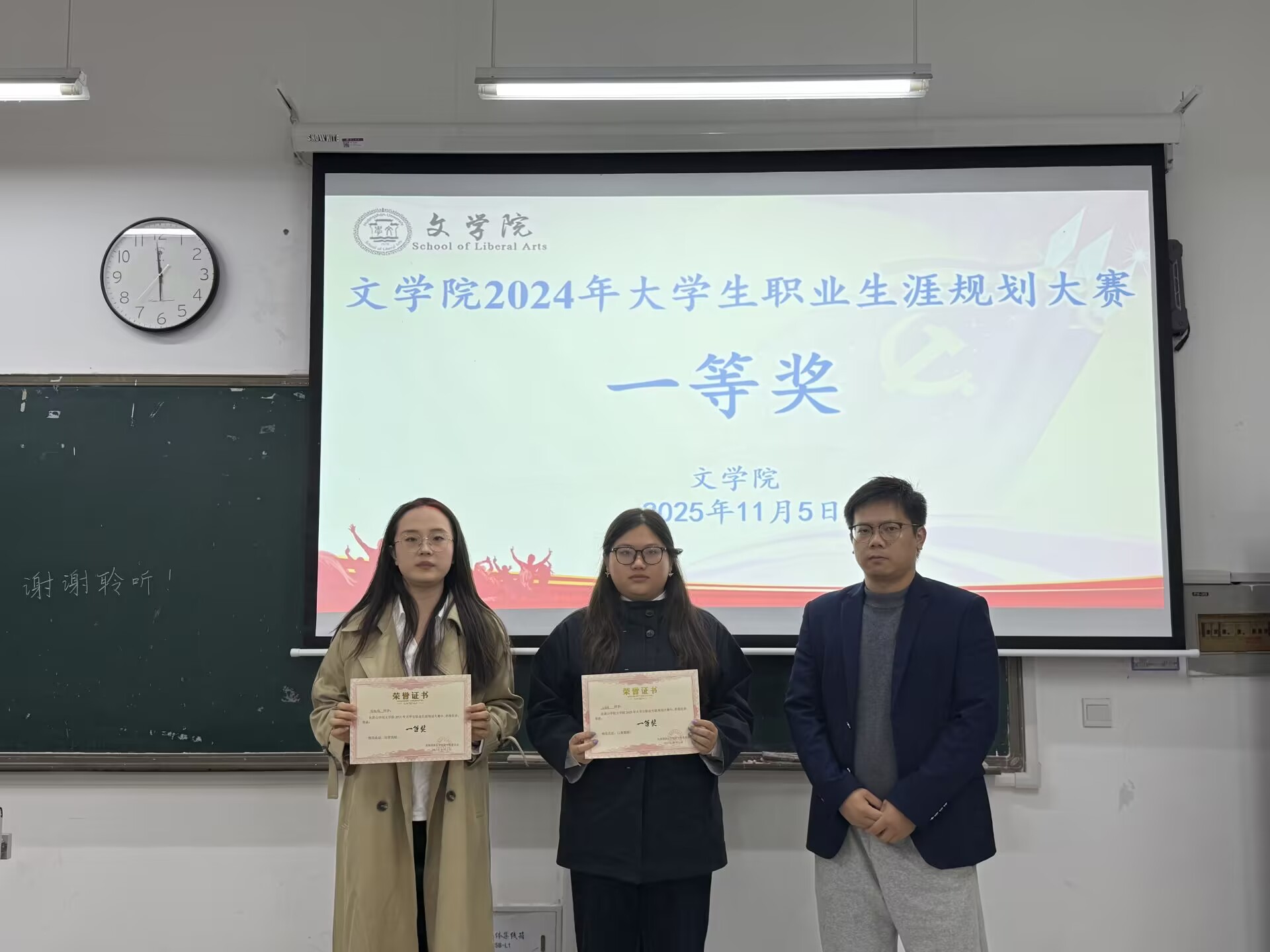 最后,经过公正评判,23中文2班王俣希、25中文专升本班徐微微荣获2025年老员工职业生涯规划大赛一等奖,并代表公司参加校级职业规划大赛。