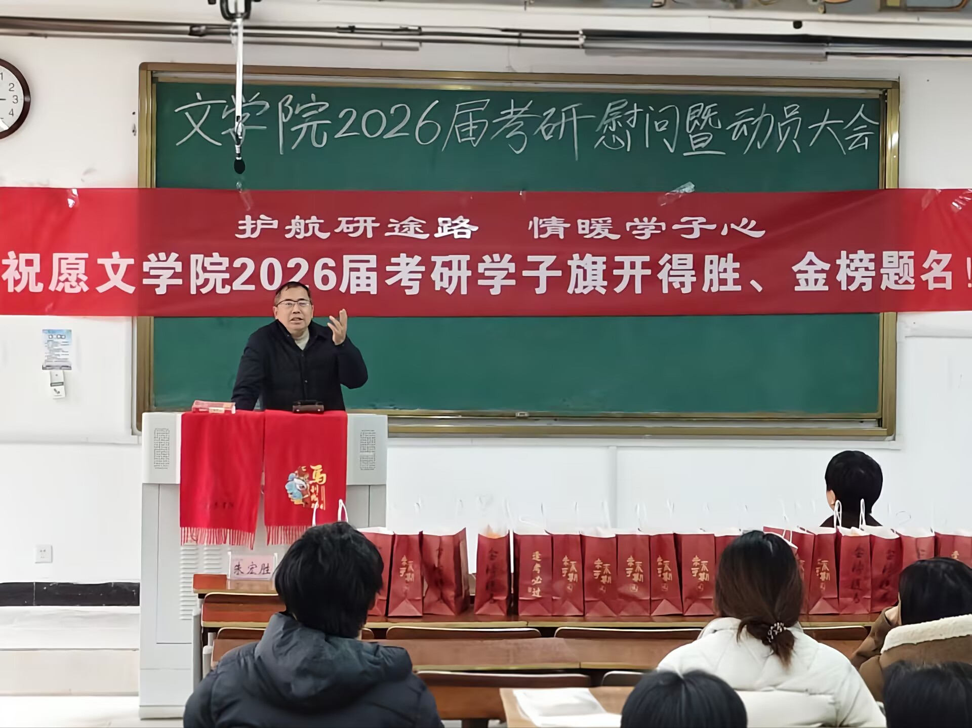 朱宏胜在动员讲话中充分肯定了同学们为考研付出的努力,并就最后冲刺阶段的复习策略与答题技巧提出了具体建议。他希望同学们保持信心、调整好身心状态,全力以赴,冲刺上岸。