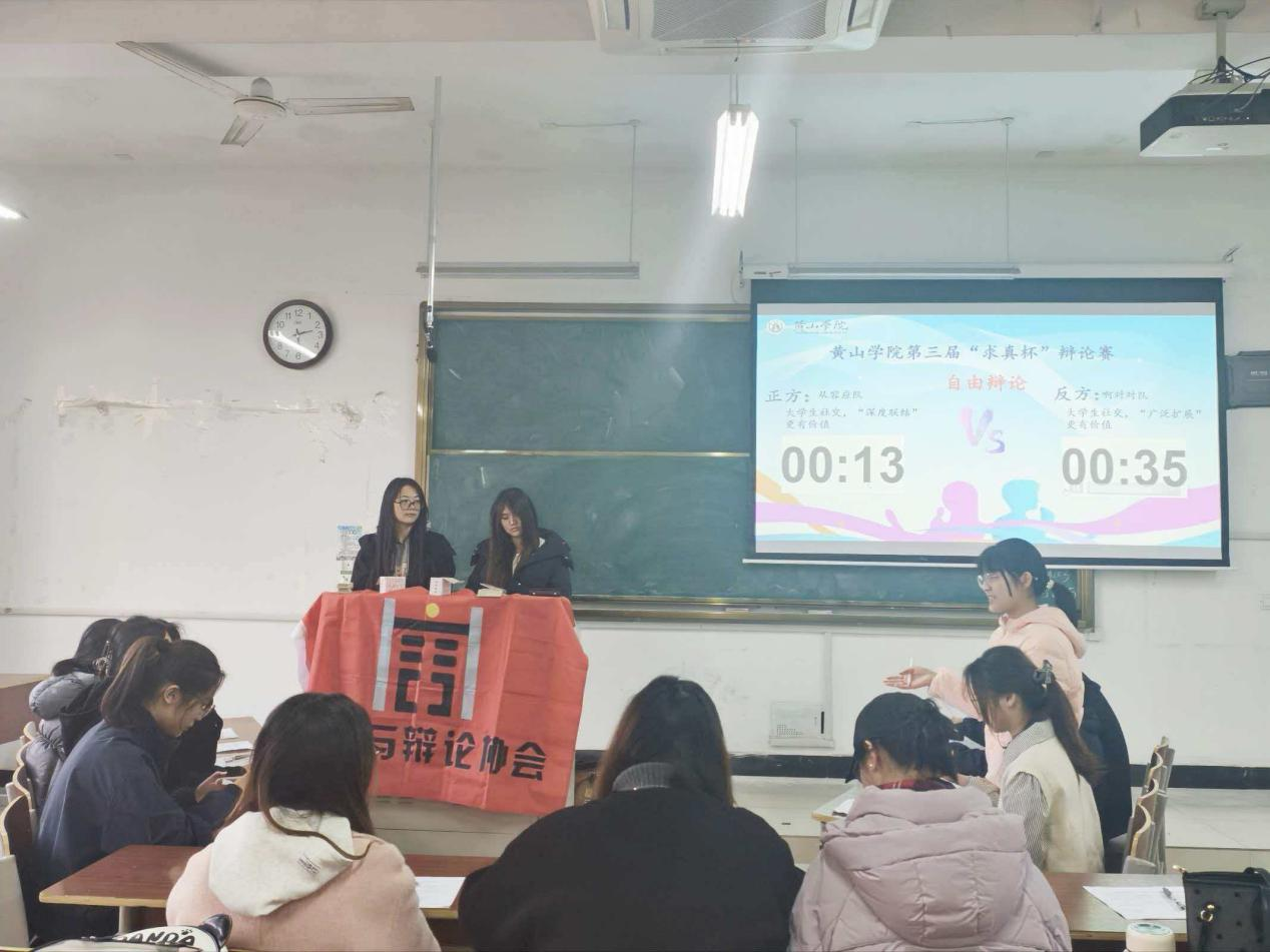 2025年12月6日williamhill官方网站第三届“求真杯”辩论赛决赛在文端楼2205教室正式开赛。本次赛事由校“演讲与辩论协会”主办,比赛接连展开,现场氛围热烈,思辨气息浓厚。