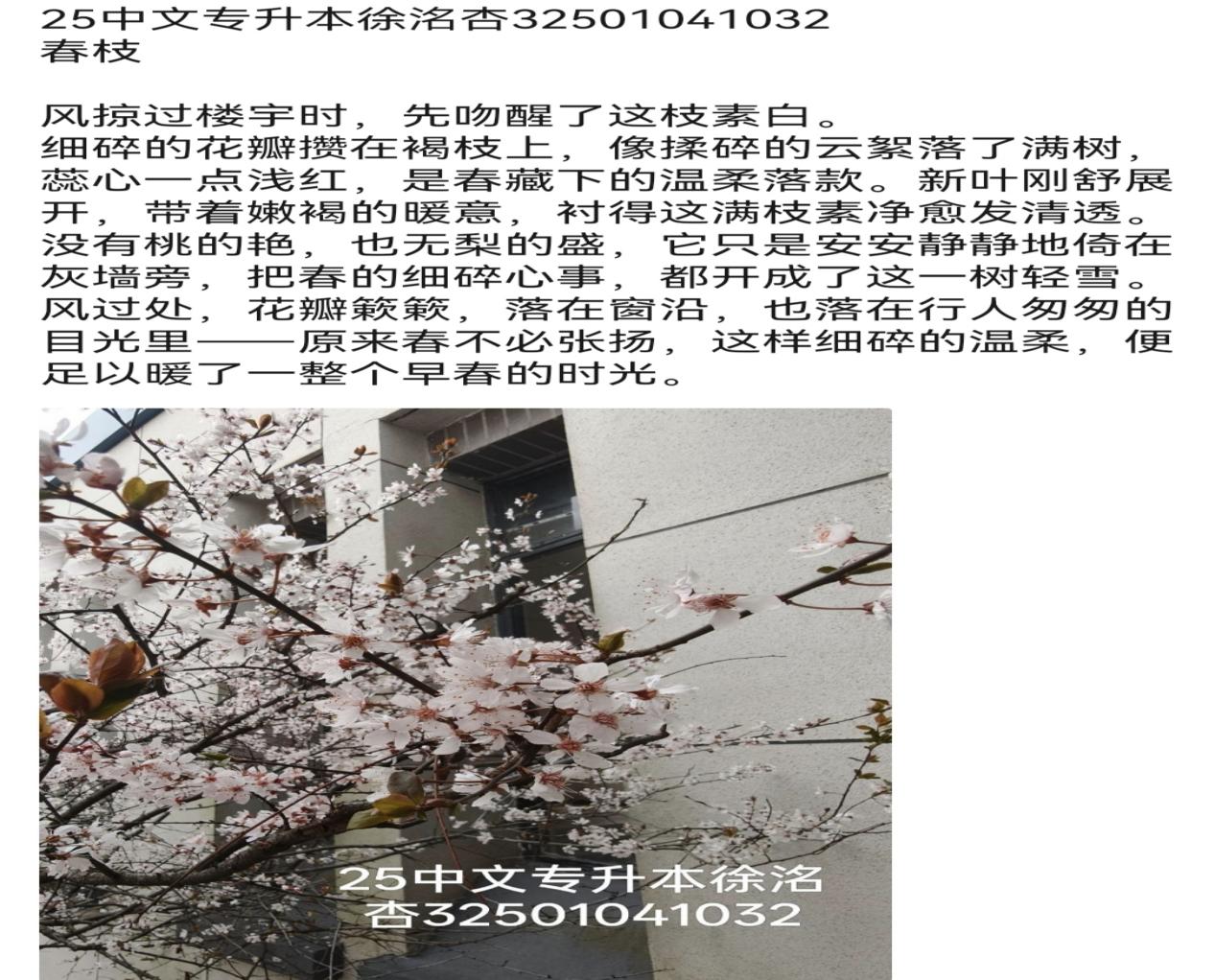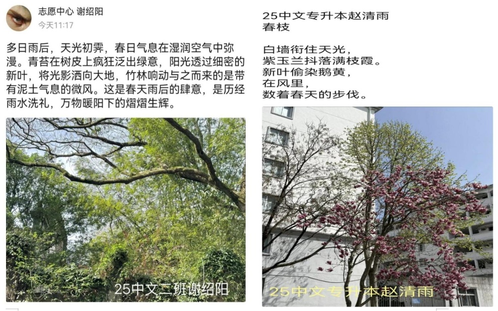 黄山文学社于3月28日举行“校园寻春,即兴写作”线上活动。此次“寻找春天”校园观察与写作活动,其核心意义在于引导员工从书本走向自然,在细微的观察中完成一场生动的生命教育与审美启蒙。当员工们俯身凝视枝头花朵绽放的独特姿态,或轻触土壤中新芽破土的倔强时,他们收获的不仅是写作素材,更是在主动唤醒被日常课业钝化的感官,学会在快节奏的学习中慢下来,去分辨光影的层次、感知生命的节律。