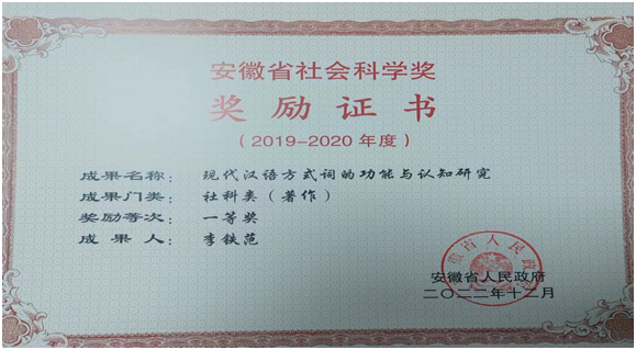 近日,公司李铁范教授专著《现代汉语方式词的功能与认知研究》(科学出版社),通过专家严格评审,喜获得安徽省人民政府2019—2020年度省社会科学奖一等奖,这是公司办学以来首次获得该等次奖项。