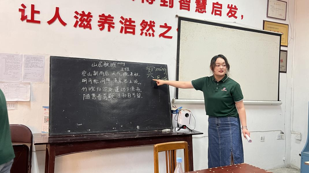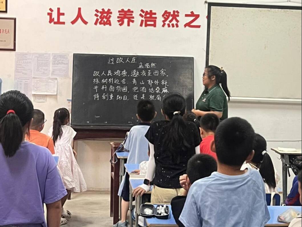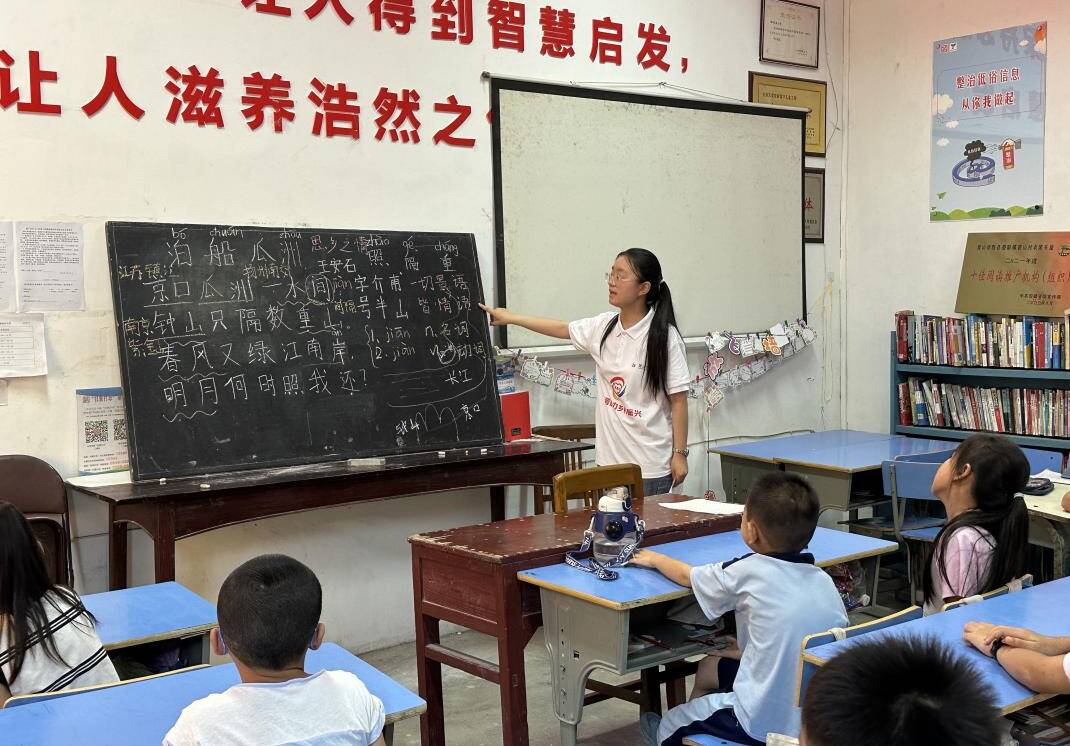 在碧山村“阳光之家”国学小课堂上,队员带领孩子们朗诵《过古人庄》、《山居秋暝》、《泊窗瓜洲》等中华经典诗词,讲解诗词的创作背景和表达意境,与孩子们一起充分互动、深情吟诵,一起感受中华经典诗词的独特魅力,在孩子们心中播下传统文化的种子,激发他们热爱祖国、珍惜生活、热爱优秀文化的情感。